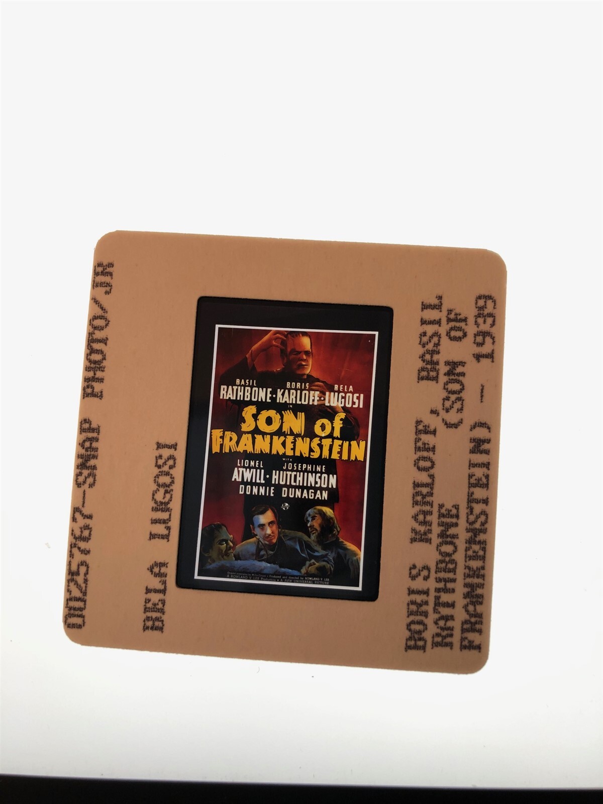 Son Of Frankenstein Movie Poster Art Universal Horror 35mm Transparency This is a vintage photo agency or photographer's 35 mm color slide transparency from our historic archive. This vintage transparency was taken of artwork, poster or magazine cover, likely some time after the original artwork or item was produced. This is a real collector's item and would make superb quality photographs or prints. This would also be a great addition to any collection or image archive. This original color slide transparency is in Excellent condition. This collector's item is being sold from one collector to another, no rights are given or implied. Silver Screen Mementos are gradually releasing from their vast archives thousands of original photographs, transparencies, negatives, slides, lobby cards and other movie or television memorabilia.