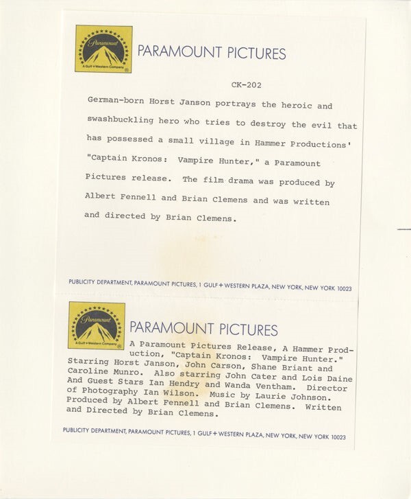 Captain Kronos Vampire Hunter Horst Janson Hammer Horror Original 8x10 Photo with Snipe 1972 Near Mint Condition This item is an ORIGINAL 8x10 photo from the historic archives of Silver Screen Mementos. This original photograph was made in the actual year the film, television show or event was produced. The movie studios produced publicity photographs for distribution to the press, photo agencies and publicity departments to advertise the film/tv show or event. Very often original photos have press release information on the reverse of the photo - movie credits, description of the scene, event and people involved. This is a historic piece of cinema art and is being offered from one collector to another, no rights given or implied. Silver Screen are gradually releasing thousands of Original Photographs, Transparencies, Negatives, Lobby Cards, Posters, Magazines and other memorabilia from our historic archive.