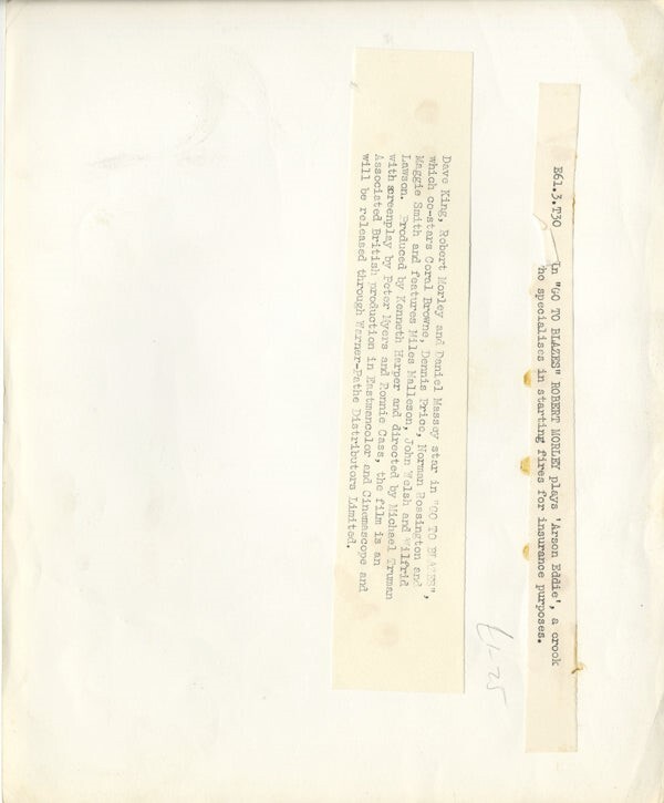 Robert Morley Go to Blazes 1962 Publicity Portrait Original 8x10 Photo with Snipe Good Condition (surface marks) This item is an ORIGINAL 8x10 photo from the historic archives of Silver Screen Mementos. This original photograph was made in the actual year the film, television show or event was produced. The movie studios produced publicity photographs for distribution to the press, photo agencies and publicity departments to advertise the film/tv show or event. Very often original photos have press release information on the reverse of the photo - movie credits, description of the scene, event and people involved. This is a historic piece of cinema art and is being offered from one collector to another, no rights given or implied. Silver Screen are gradually releasing thousands of Original Photographs, Transparencies, Negatives, Lobby Cards, Posters, Magazines and other memorabilia from our historic archive.