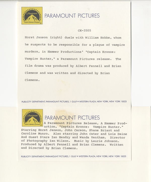 Captain Kronos Vampire Hunter Horst Janson, William Hobbs Sword Fight Hammer Horror Original 8x10 Photo 1972 with Snipe Near Mint Condition This item is an ORIGINAL 8x10 photo from the historic archives of Silver Screen Mementos. This original photograph was made in the actual year the film, television show or event was produced. The movie studios produced publicity photographs for distribution to the press, photo agencies and publicity departments to advertise the film/tv show or event. Very often original photos have press release information on the reverse of the photo - movie credits, description of the scene, event and people involved. This is a historic piece of cinema art and is being offered from one collector to another, no rights given or implied. Silver Screen are gradually releasing thousands of Original Photographs, Transparencies, Negatives, Lobby Cards, Posters, Magazines and other memorabilia from our historic archive.