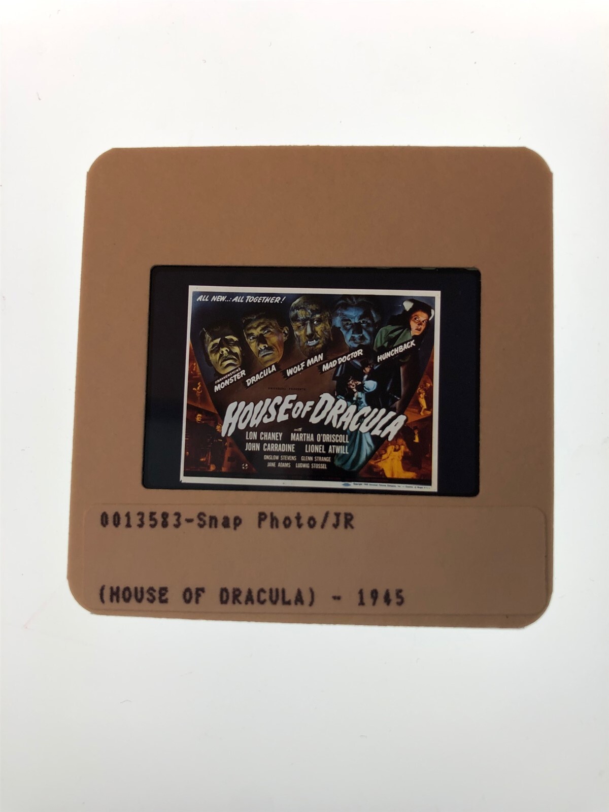 House of Dracula Movie Poster Artwork Frankenstein Wolf Man 35mm Transparency This is a vintage photo agency or photographer's 35 mm color slide transparency from our historic archive. This vintage transparency was taken of artwork, poster or magazine cover, likely some time after the original artwork or item was produced. This is a real collector's item and would make superb quality photographs or prints. This would also be a great addition to any collection or image archive. This original color slide transparency is in Excellent condition. This collector's item is being sold from one collector to another, no rights are given or implied. Silver Screen Mementos are gradually releasing from their vast archives thousands of original photographs, transparencies, negatives, slides, lobby cards and other movie or television memorabilia.