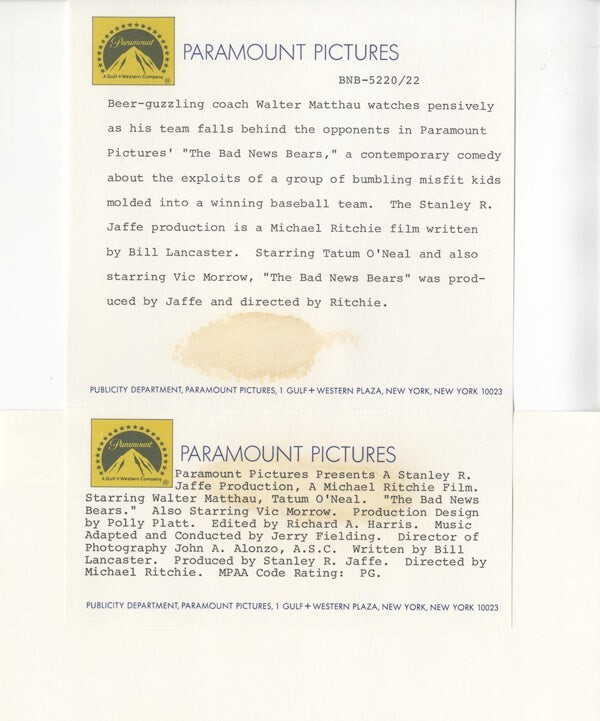 The Bad News Bears 1976 Walter Matthau in dugout drinking beer Original 8x10 Photo with paper caption snipe - Near Mint Condition This item is an ORIGINAL 8x10 photo from the historic archives of Silver Screen Mementos. This original photograph was made in the actual year the film, television show or event was produced. The movie studios produced publicity photographs for distribution to the press, photo agencies and publicity departments to advertise the film/tv show or event. Very often original photos have press release information on the reverse of the photo - movie credits, description of the scene, event and people involved. This is a historic piece of cinema art and is being offered from one collector to another, no rights given or implied. Silver Screen are gradually releasing thousands of Original Photographs, Transparencies, Negatives, Lobby Cards, Posters, Magazines and other memorabilia from our historic archive.