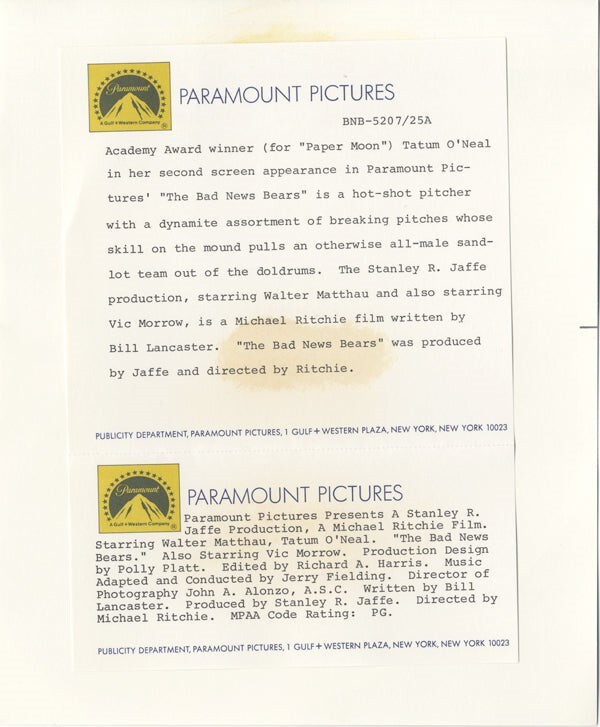 The Bad News Bears 1976 Tatum O'Neal portrait in sun hat Original 8x10 Photo with paper caption snipe - Near Mint Condition This item is an ORIGINAL 8x10 photo from the historic archives of Silver Screen Mementos. This original photograph was made in the actual year the film, television show or event was produced. The movie studios produced publicity photographs for distribution to the press, photo agencies and publicity departments to advertise the film/tv show or event. Very often original photos have press release information on the reverse of the photo - movie credits, description of the scene, event and people involved. This is a historic piece of cinema art and is being offered from one collector to another, no rights given or implied. Silver Screen are gradually releasing thousands of Original Photographs, Transparencies, Negatives, Lobby Cards, Posters, Magazines and other memorabilia from our historic archive.