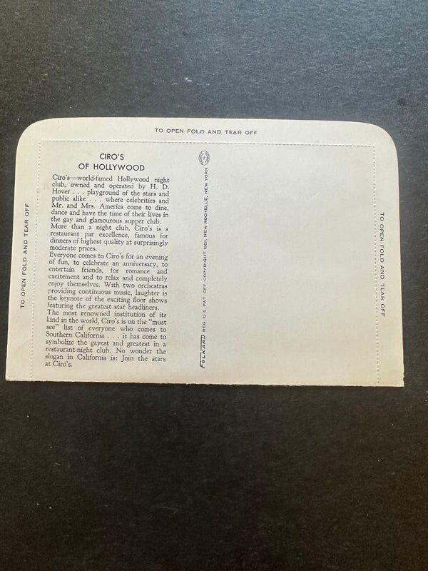 Ciro's Hollywood Nightclub of the Stars Vintage Original Promo Card c 1950's , measuring approx 4x6 inches We are gradually releasing from our historic archives original photographs, negatives, transparency, slides, movie posters, magazines, books, press books, pins, autographs, trading cards, press badges and other rare collectors items.