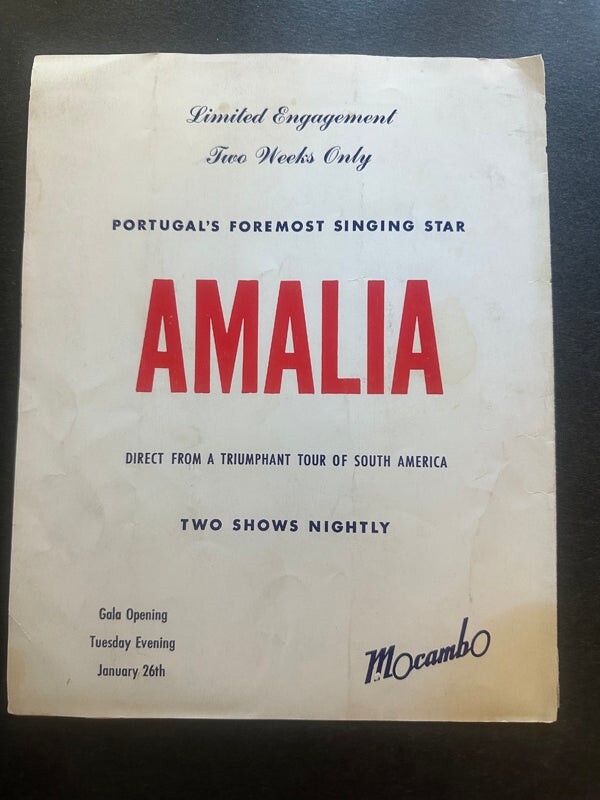 Mocambo Hollywood Nightclub Original Souvenir Foldout 4 page Brochure featuring portugese singing star Amalia. VG Condition We are gradually releasing from our historic archives original photographs, negatives, transparency, slides, movie posters, magazines, books, press books, pins, autographs, trading cards, press badges and other rare collectors items.