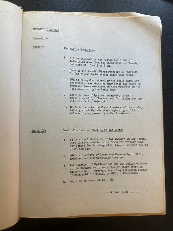 Meet Me In Las Vegas 1956 Movie Premiere Event Sands Casino Hotel Las Vegas, feauting press and promotional actiity and schedule including the Milton Berle Show, for the film starring Cyd Charisse and Dan Dailey. We are gradually releasing from our historic archives original photographs, negatives, transparency, slides, movie posters, magazines, books, press books, pins, autographs, trading cards, press badges and other rare collectors items.