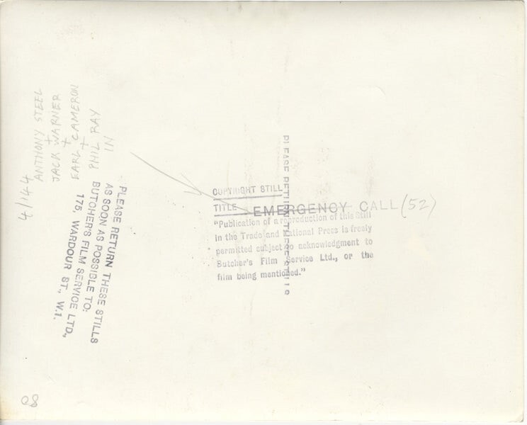 Emergency Call 1952 Jack Warner Anthony Steel Earl Cameron Phil Ray Original 8x10 Photo Stamped AKA The Hundred Hour Hunt VG Condition This item is an ORIGINAL 8x10 photo from the historic archives of Silver Screen Mementos. This original photograph was made in the actual year the film, television show or event was produced. The movie studios produced publicity photographs for distribution to the press, photo agencies and publicity departments to advertise the film/tv show or event. Very often original photos have press release information on the reverse of the photo - movie credits, description of the scene, event and people involved. This is a historic piece of cinema art and is being offered from one collector to another, no rights given or implied. Silver Screen are gradually releasing thousands of Original Photographs, Transparencies, Negatives, Lobby Cards, Posters, Magazines and other memorabilia from our historic archive.