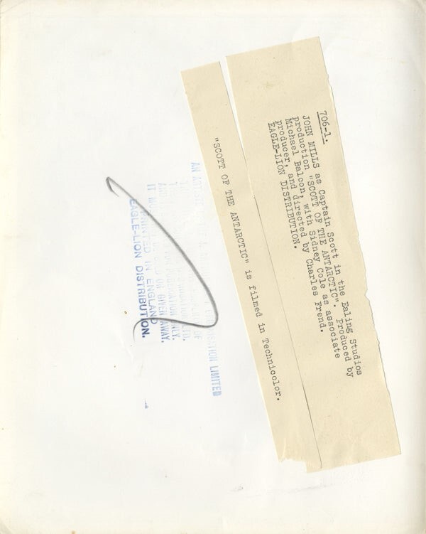 Scott of the Antarctic 1948 John Mills Stamped Original 8x10 Photo with snipe Good Condition (small mark top middle) This item is an ORIGINAL 8x10 photo from the historic archives of Silver Screen Mementos. This original photograph was made in the actual year the film, television show or event was produced. The movie studios produced publicity photographs for distribution to the press, photo agencies and publicity departments to advertise the film/tv show or event. Very often original photos have press release information on the reverse of the photo - movie credits, description of the scene, event and people involved. This is a historic piece of cinema art and is being offered from one collector to another, no rights given or implied. Silver Screen are gradually releasing thousands of Original Photographs, Transparencies, Negatives, Lobby Cards, Posters, Magazines and other memorabilia from our historic archive.