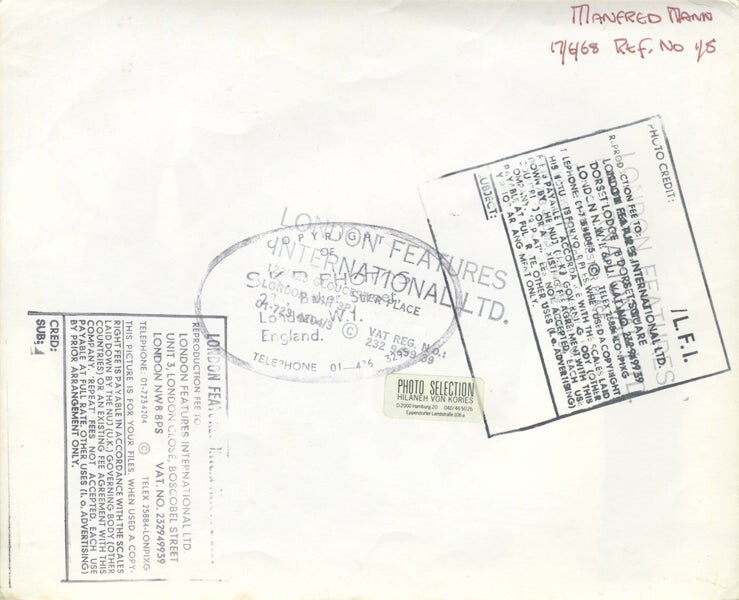 Manfred Mann 1960's Pop Rock Group stamped Original 8x10 Photo VG/Near Mint Condition This is an Original vintage photograph from the year of the concert, photo shoot or event measuring approximately 8x10 inches (20x25 cm) unless otherwise stated. Many Original vintage photographs carry the agency or photographer stamp on the back. This is a rare collectors item being offered from one collector to another, no nights given or implied. Silver Screen are gradually releasing thousands of Original Photographs, Transparencies, Negatives, Lobby Cards, Posters, Magazines and other memorabilia from our historic archive.