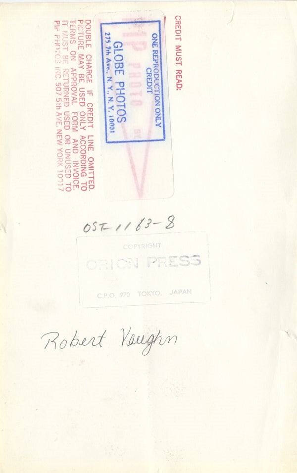 Robert Vaughn Man from UNCLE pose by movie poster Japan Original Stamped Photo - rare Stamped 6x10 inch approx Photograph in Good Condition (border trim) This item is an ORIGINAL 8x10 photo from the historic archives of Silver Screen Mementos. This original photograph was made in the actual year the film, television show or event was produced. The movie studios produced publicity photographs for distribution to the press, photo agencies and publicity departments to advertise the film/tv show or event. Very often original photos have press release information on the reverse of the photo - movie credits, description of the scene, event and people involved. This is a historic piece of cinema art and is being offered from one collector to another, no rights given or implied. Silver Screen are gradually releasing thousands of Original Photographs, Transparencies, Negatives, Lobby Cards, Posters, Magazines and other memorabilia from our historic archive.