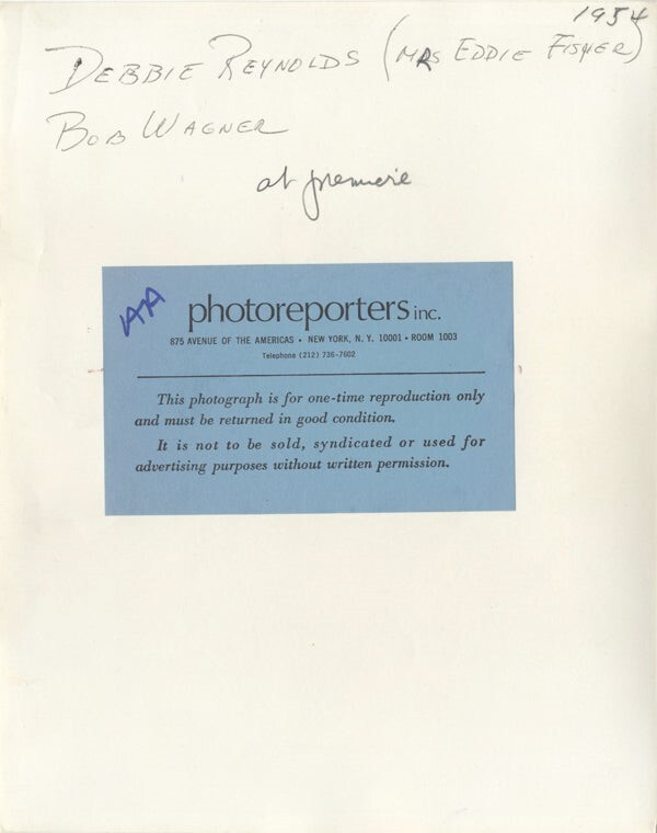 Robert Wagner & Debbie Reynolds 1954 Movie Premiere Stamped Original 8x10 Photo VG/Near Mint Condition This item is an ORIGINAL 8x10 photo from the historic archives of Silver Screen Mementos. This original photograph was made in the actual year the film, television show or event was produced. The movie studios produced publicity photographs for distribution to the press, photo agencies and publicity departments to advertise the film/tv show or event. Very often original photos have press release information on the reverse of the photo - movie credits, description of the scene, event and people involved. This is a historic piece of cinema art and is being offered from one collector to another, no rights given or implied. Silver Screen are gradually releasing thousands of Original Photographs, Transparencies, Negatives, Lobby Cards, Posters, Magazines and other memorabilia from our historic archive.