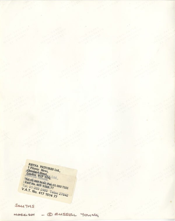 The Smiths Morrissey Iconic Portrait Oscar Wilde T-Shirt Original Stamped 8x10 Photo - This is a truly wonderful image of the enigmatic rock icon wearing an Oscar Wilde t-shirt - Near Mint Condition This is an Original vintage photograph from the year of the concert, photo shoot or event measuring approximately 8x10 inches (20x25 cm) unless otherwise stated. Many Original vintage photographs carry the agency or photographer stamp on the back. This is a rare collectors item being offered from one collector to another, no nights given or implied. Silver Screen are gradually releasing thousands of Original Photographs, Transparencies, Negatives, Lobby Cards, Posters, Magazines and other memorabilia from our historic archive.
