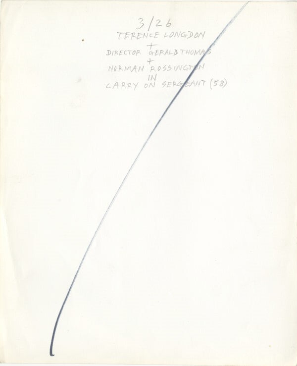 Carry on Sergeant 1958 Terence Longdon Norman Rossington and Director Gerald Thomas 8x10 Original Photo This item is an ORIGINAL 8x10 photo from the historic archives of Silver Screen Mementos. This original photograph was made in the actual year the film, television show or event was produced. The movie studios produced publicity photographs for distribution to the press, photo agencies and publicity departments to advertise the film/tv show or event. Very often original photos have press release information on the reverse of the photo - movie credits, description of the scene, event and people involved. This is a historic piece of cinema art and is being offered from one collector to another, no rights given or implied. Silver Screen are gradually releasing thousands of Original Photographs, Transparencies, Negatives, Lobby Cards, Posters, Magazines and other memorabilia from our historic archive.