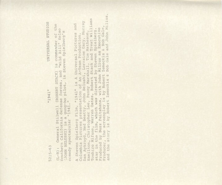 1941 Steven Spielberg film Robert Stack John Belushi Original Stamped 8x10 Photo Near Mint This item is an ORIGINAL 8x10 photo from the historic archives of Silver Screen Mementos. This original photograph was made in the actual year the film, television show or event was produced. The movie studios produced publicity photographs for distribution to the press, photo agencies and publicity departments to advertise the film/tv show or event. Very often original photos have press release information on the reverse of the photo - movie credits, description of the scene, event and people involved. This is a historic piece of cinema art and is being offered from one collector to another, no rights given or implied. Silver Screen are gradually releasing thousands of Original Photographs, Transparencies, Negatives, Lobby Cards, Posters, Magazines and other memorabilia from our historic archive.