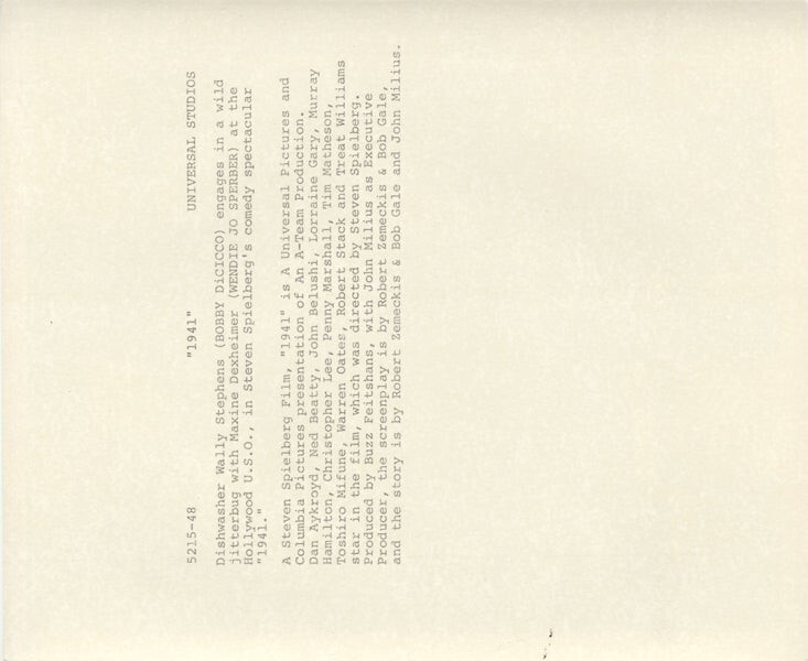 1941 Steven Spielberg film Bobby DiCicco Wendie Jo Sperber Original Stamped 8x10 Photo This item is an ORIGINAL 8x10 photo from the historic archives of Silver Screen Mementos. This original photograph was made in the actual year the film, television show or event was produced. The movie studios produced publicity photographs for distribution to the press, photo agencies and publicity departments to advertise the film/tv show or event. Very often original photos have press release information on the reverse of the photo - movie credits, description of the scene, event and people involved. This is a historic piece of cinema art and is being offered from one collector to another, no rights given or implied. Silver Screen are gradually releasing thousands of Original Photographs, Transparencies, Negatives, Lobby Cards, Posters, Magazines and other memorabilia from our historic archive.