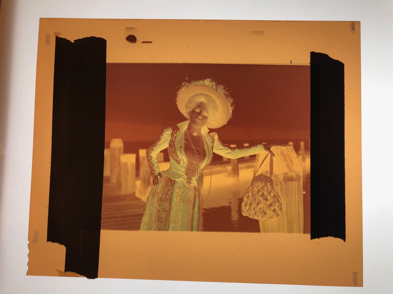 Barbra Streisand fashion pose on docks Hello Dolly 1969 Vintage 8x10 Color Inter NegativeThis is a vintage studio or photographer's 8x10 inch inch inch color Inter negative created from the original camera negative or transparency . This is a real collector's item and would make superb quality photographs or prints. This would also be a great addition to any collection or image archive. This black and white photographic negative is in Excellent condition. This collector's item is being sold from one collector to another, no rights are given or implied. Silver Screen Mementos are gradually releasing from their vast archives thousands of original photographs, transparencies, negatives, slides, lobby cards and other movie or television memorabilia. from our historic archive.
