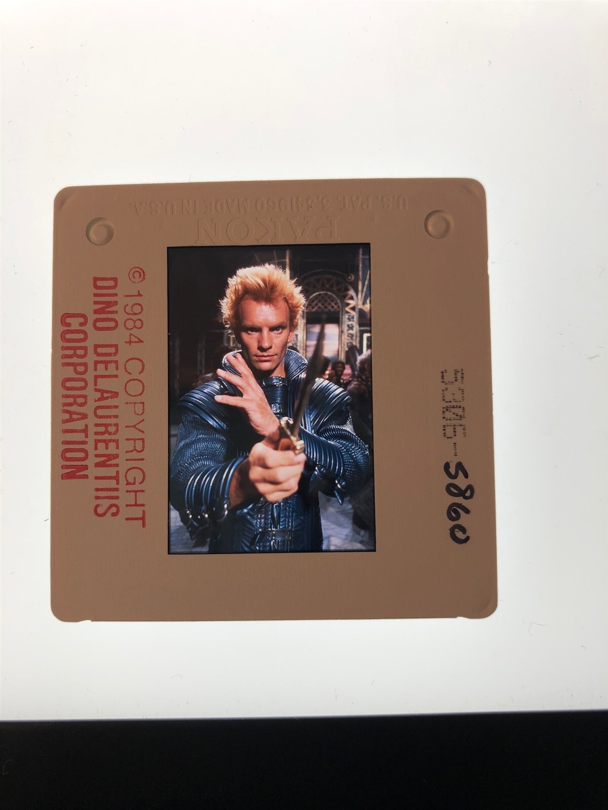 Dune Sting Feyd Rautha holding dagger Original 35mm Transparency Stamped Mount 1984This is an original studio or photographer's 35 mm color slide transparency from our historic archive. This is a real collector's item and would make superb quality photographs or prints. This would also be a great addition to any collection or image archive. This original color slide transparency is in Excellent condition. This collector's item is being sold from one collector to another, no rights are given or implied. Silver Screen Mementos are gradually releasing from their vast archives thousands of original photographs, transparencies, negatives, slides, lobby cards and other movie or television memorabilia.