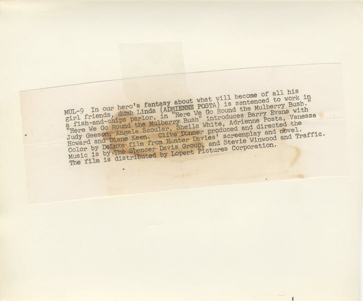 Here We Go Round the Mulberry Bush 1968 Adrienne Posta Fish and Chips Girl Original 8x10 Photo with Snipe. VG/Near Mint Condition This item is an ORIGINAL 8x10 photo from the historic archives of Silver Screen Mementos. This original photograph was made in the actual year the film, television show or event was produced. The movie studios produced publicity photographs for distribution to the press, photo agencies and publicity departments to advertise the film/tv show or event. Very often original photos have press release information on the reverse of the photo - movie credits, description of the scene, event and people involved. This is a historic piece of cinema art and is being offered from one collector to another, no rights given or implied. Silver Screen are gradually releasing thousands of Original Photographs, Transparencies, Negatives, Lobby Cards, Posters, Magazines and other memorabilia from our historic archive.