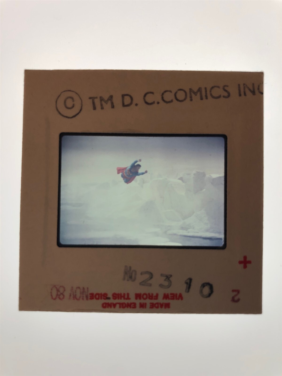 Superman 2 flying over icy glacier scene Camera Original 35mm Transparency Stamped Mount 1980This is an original studio or photographer's 35 mm color slide transparency from our historic archive. This is a real collector's item and would make superb quality photographs or prints. This would also be a great addition to any collection or image archive. This original color slide transparency is in Excellent condition. This collector's item is being sold from one collector to another, no rights are given or implied. Silver Screen Mementos are gradually releasing from their vast archives thousands of original photographs, transparencies, negatives, slides, lobby cards and other movie or television memorabilia.