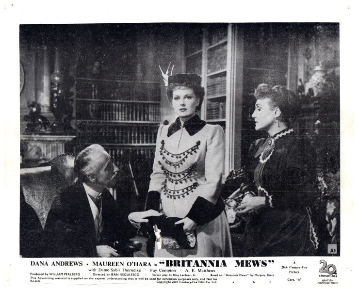 Britannia Mews 1949 AKA Forbidden Street Original Lobby Card Dana Andrews Maureen O'Hara VG Condition Silver Screen Mementos are pleased to be able to offer this authentic original Lobby Card measuring 8x10 inches. This lobby card is from Great Britain and was printed during the actual year the film was released in movie theaters. The lobby card (also known as Front of House/ FOH card in the UK) was created by the film studios to publicize the movie and was intended for display outside the movie theatre in special glass display boxes. These are NOT reproductions! You are looking at a truly original piece of cinema art, a genuine collector's item. We have a huge archive of over 250,000 original lobby cards, mostly from the 1930's to the 1980's. We will be releasing many more rare gems from our vast collection, which will include lobby cards, original photographs, movie stills, magazines, brochures negatives, transparencies, slides and other collectible items of movie memorabilia.