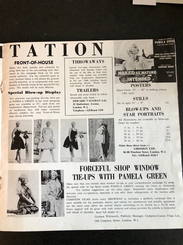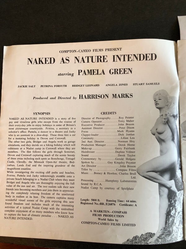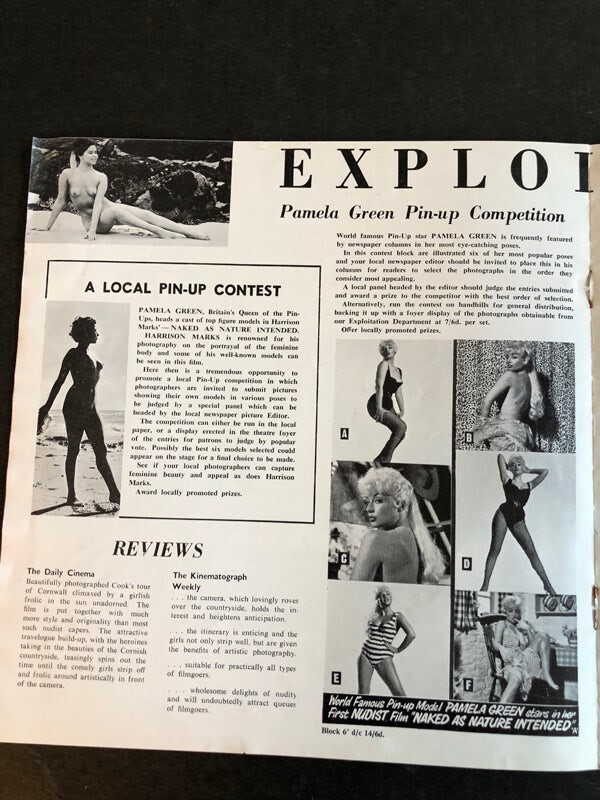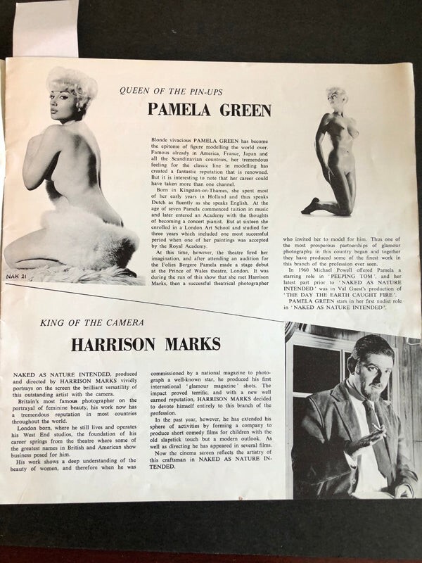 Naked as Nature Intended Original Pressbook Pamela Green Harrison Marks Naturist - This is an extremely rare 12 page illustrated original 1961 British pressbook for the naturist documentary movie from Harrison Marks featuring Pamela Green with many pictures, articles, movie poster artwork etc from the movie. VG Condition A movie pressbook is a promotional tool used by film studios and distributors to advertise and market a movie before its release. It's essentially a booklet or a package containing various materials like synopsis, promotional images, posters, advertising materials, cast and crew information, suggested promotional strategies, and more. These pressbooks were produced in very low quantities and distributed to theater owners and exhibitors to assist them in promoting the film in their localities. They were valuable because they provided crucial information and materials necessary for the marketing and promotion of the movie. Pressbooks often contained suggestions for marketing strategies, including how to display posters, design newspaper ads, and generate interest in the film within the local community.Today, movie pressbooks have become collector's items due to their historical significance and rarity. They offer insights into the marketing and promotional strategies of films from different eras, making them valuable for movie enthusiasts, collectors, historians, and even those interested in advertising and marketing history. The scarcity of these items, especially for older or iconic films, contributes to their value among collectors and enthusiasts of cinema memorabilia.A real Collectors’ item being released from our historic archives, this is a complete vintage magazine. Silver Screen Mementos are gradually releasing from their vast archives thousands of original photographs, transparencies, negatives, slides, lobby cards, magazines, brochures, press books and other movie or television memorabilia.
