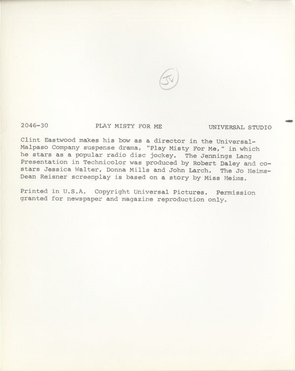 Clint Eastwood Play Misty for Me 1971 Close up Scene Original 7x9 approx Photo Stamped with Snipe VG Condition This item is an ORIGINAL 8x10 photo from the historic archives of Silver Screen Mementos. This original photograph was made in the actual year the film, television show or event was produced. The movie studios produced publicity photographs for distribution to the press, photo agencies and publicity departments to advertise the film/tv show or event. Very often original photos have press release information on the reverse of the photo - movie credits, description of the scene, event and people involved. This is a historic piece of cinema art and is being offered from one collector to another, no rights given or implied. Silver Screen are gradually releasing thousands of Original Photographs, Transparencies, Negatives, Lobby Cards, Posters, Magazines and other memorabilia from our historic archive.