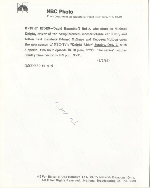 David Hasselhoff Edward Mulhare Rebecca Holden Original 7x9 NBC stamped Photo KITT car Near Mint Condition This item is an ORIGINAL 8x10 photo from the historic archives of Silver Screen Mementos. This original photograph was made in the actual year the film, television show or event was produced. The movie studios produced publicity photographs for distribution to the press, photo agencies and publicity departments to advertise the film/tv show or event. Very often original photos have press release information on the reverse of the photo - movie credits, description of the scene, event and people involved. This is a historic piece of cinema art and is being offered from one collector to another, no rights given or implied. Silver Screen are gradually releasing thousands of Original Photographs, Transparencies, Negatives, Lobby Cards, Posters, Magazines and other memorabilia from our historic archive.