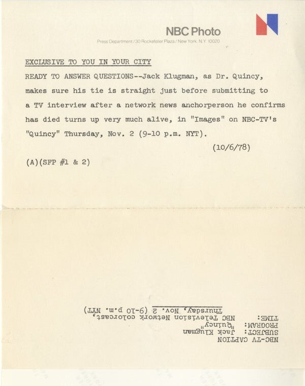 Jack Klugman Quincy Images Episode Publicity Original 7x9 Photo with NBC Snipe 1978 Near Mint Condition This item is an ORIGINAL 8x10 photo from the historic archives of Silver Screen Mementos. This original photograph was made in the actual year the film, television show or event was produced. The movie studios produced publicity photographs for distribution to the press, photo agencies and publicity departments to advertise the film/tv show or event. Very often original photos have press release information on the reverse of the photo - movie credits, description of the scene, event and people involved. This is a historic piece of cinema art and is being offered from one collector to another, no rights given or implied. Silver Screen are gradually releasing thousands of Original Photographs, Transparencies, Negatives, Lobby Cards, Posters, Magazines and other memorabilia from our historic archive.