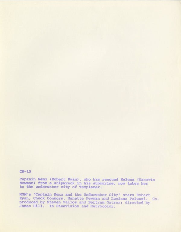 Captain Nemo & the Underwater City Robert Ryan Nanette Newman Original Photo VG/Near Mint Condition This item is an ORIGINAL 8x10 photo from the historic archives of Silver Screen Mementos. This original photograph was made in the actual year the film, television show or event was produced. The movie studios produced publicity photographs for distribution to the press, photo agencies and publicity departments to advertise the film/tv show or event. Very often original photos have press release information on the reverse of the photo - movie credits, description of the scene, event and people involved. This is a historic piece of cinema art and is being offered from one collector to another, no rights given or implied. Silver Screen are gradually releasing thousands of Original Photographs, Transparencies, Negatives, Lobby Cards, Posters, Magazines and other memorabilia from our historic archive.