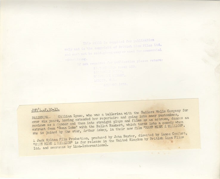 Gillian Lynne Make Mine A Million Ballet Pose Original 8x10 Photo Stamped with Snipe 1959 VG Condition This item is an ORIGINAL 8x10 photo from the historic archives of Silver Screen Mementos. This original photograph was made in the actual year the film, television show or event was produced. The movie studios produced publicity photographs for distribution to the press, photo agencies and publicity departments to advertise the film/tv show or event. Very often original photos have press release information on the reverse of the photo - movie credits, description of the scene, event and people involved. This is a historic piece of cinema art and is being offered from one collector to another, no rights given or implied. Silver Screen are gradually releasing thousands of Original Photographs, Transparencies, Negatives, Lobby Cards, Posters, Magazines and other memorabilia from our historic archive.