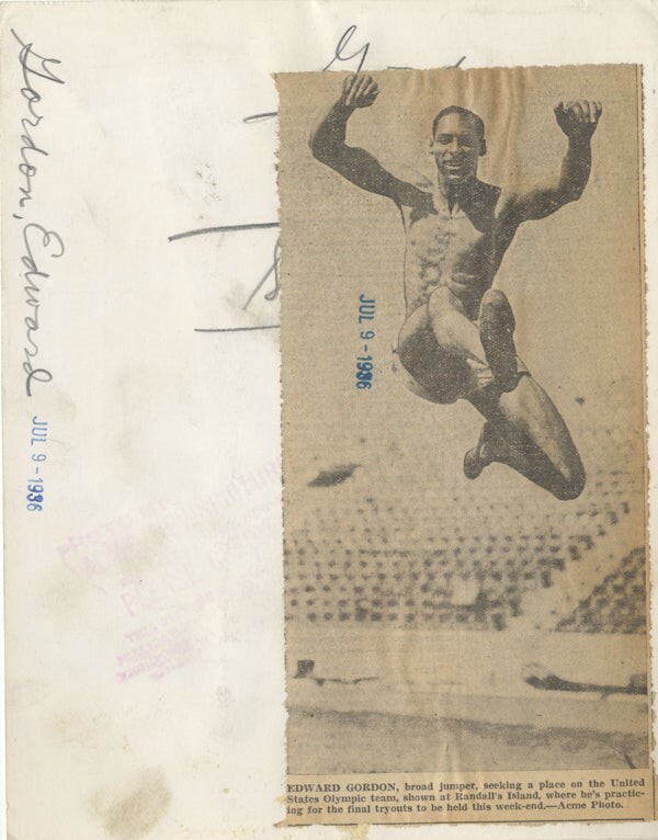 Edward Gordon Shirtless Muscular Long Jump US Olympic Track & Field Star Leaping Midair during final tryouts for team Original 7x9 Photo 1936 with Newspaper Photo and caption. VG Condition This is an original photograph from our historic archives. We have a huge archive of original photographs, negatives, transparencies, posters, magazines and rare memorabilia that we are gradually releasing.