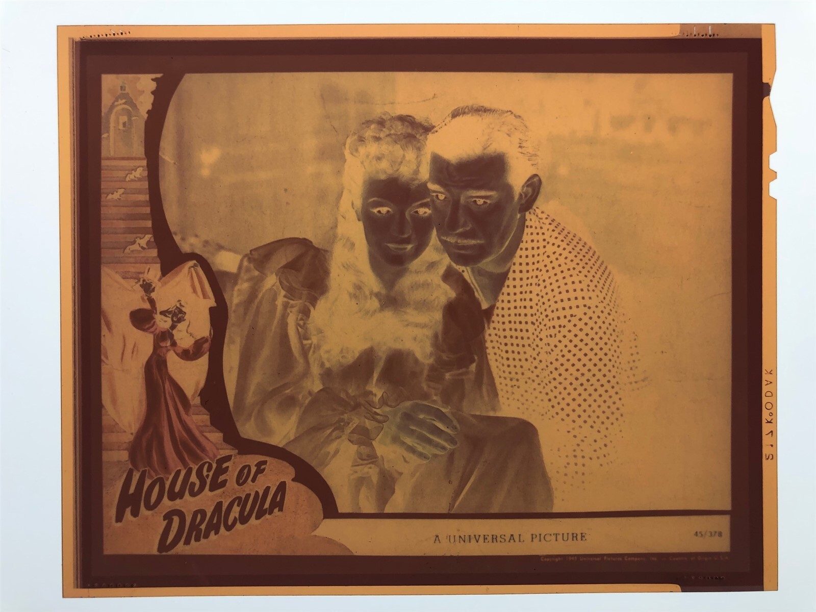 House of Dracula Lobby Card art Vintage Lon Chaney Jr. 4x5 Color Inter NegativeThis is a vintage studio or photographers color 4x5 inch negative. This is a real collector's item and would make superb quality photographs or prints. This would also be a great addition to any collection or image archive. This black and white photographic negative is in Excellent condition. This collector's item is being sold from one collector to another, no rights are given or implied. Silver Screen Mementos are gradually releasing from their vast archives thousands of original photographs, transparencies, negatives, slides, lobby cards and other movie or television memorabilia.