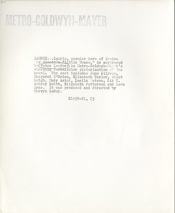 Peter Lawford Little Women 1949 Studio Portrait Original 8x10 Photo Stamped with Snipe VG/Near Mint Condition This item is an ORIGINAL 8x10 photo from the historic archives of Silver Screen Mementos. This original photograph was made in the actual year the film, television show or event was produced. The movie studios produced publicity photographs for distribution to the press, photo agencies and publicity departments to advertise the film/tv show or event. Very often original photos have press release information on the reverse of the photo - movie credits, description of the scene, event and people involved. This is a historic piece of cinema art and is being offered from one collector to another, no rights given or implied. Silver Screen are gradually releasing thousands of Original Photographs, Transparencies, Negatives, Lobby Cards, Posters, Magazines and other memorabilia from our historic archive.