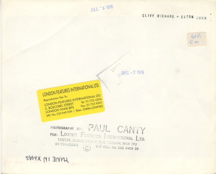 Cliff Richard & Elton John 1976 Candid 8x10 Stamped Original Photo VG/Near Mint This is an Original vintage photograph from the year of the concert, photo shoot or event measuring approximately 8x10 inches (20x25 cm) unless otherwise stated. Many Original vintage photographs carry the agency or photographer stamp on the back. This is a rare collectors item being offered from one collector to another, no nights given or implied. Silver Screen are gradually releasing thousands of Original Photographs, Transparencies, Negatives, Lobby Cards, Posters, Magazines and other memorabilia from our historic archive.