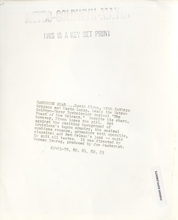 David Niven The Toast of New Orleans 1950 Publicity Portrait Original 8x10 Photo Stamped with Snipe VG Condition This item is an ORIGINAL 8x10 photo from the historic archives of Silver Screen Mementos. This original photograph was made in the actual year the film, television show or event was produced. The movie studios produced publicity photographs for distribution to the press, photo agencies and publicity departments to advertise the film/tv show or event. Very often original photos have press release information on the reverse of the photo - movie credits, description of the scene, event and people involved. This is a historic piece of cinema art and is being offered from one collector to another, no rights given or implied. Silver Screen are gradually releasing thousands of Original Photographs, Transparencies, Negatives, Lobby Cards, Posters, Magazines and other memorabilia from our historic archive.