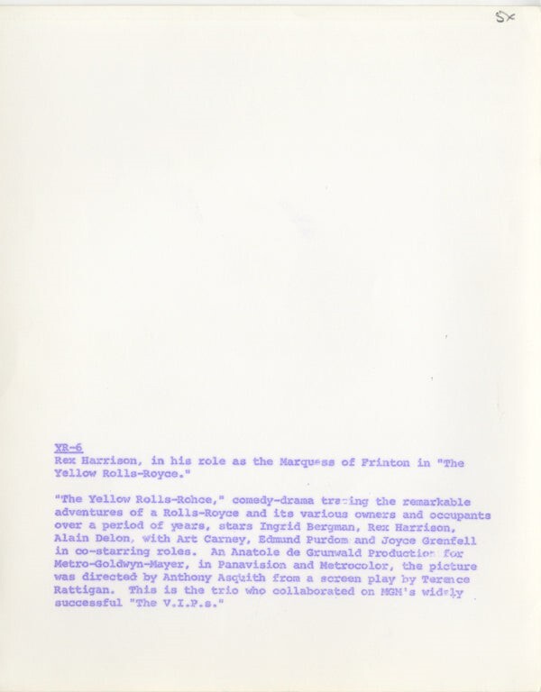Rex Harrison The Yellow Rolls-Royce portrait Original 8x10 Photo with snipe Nera Mint This item is an ORIGINAL 8x10 photo from the historic archives of Silver Screen Mementos. This original photograph was made in the actual year the film, television show or event was produced. The movie studios produced publicity photographs for distribution to the press, photo agencies and publicity departments to advertise the film/tv show or event. Very often original photos have press release information on the reverse of the photo - movie credits, description of the scene, event and people involved. This is a historic piece of cinema art and is being offered from one collector to another, no rights given or implied. Silver Screen are gradually releasing thousands of Original Photographs, Transparencies, Negatives, Lobby Cards, Posters, Magazines and other memorabilia from our historic archive.