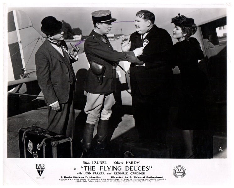 The Flying Deuces Original Lobby Card 1939 Stan Laurel Oliver Hardy Jean Parker Reginald Gardiner VG Condition Silver Screen Mementos are pleased to be able to offer this authentic original Lobby Card measuring 8x10 inches. This lobby card is from Great Britain and was printed during the actual year the film was released in movie theaters. The lobby card (also known as Front of House/ FOH card in the UK) was created by the film studios to publicize the movie and was intended for display outside the movie theatre in special glass display boxes. These are NOT reproductions! You are looking at a truly original piece of cinema art, a genuine collector's item. We have a huge archive of over 250,000 original lobby cards, mostly from the 1930's to the 1980's. We will be releasing many more rare gems from our vast collection, which will include lobby cards, original photographs, movie stills, magazines, brochures negatives, transparencies, slides and other collectible items of movie memorabilia.