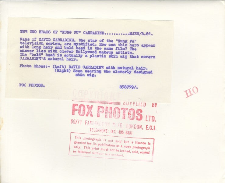 David Carradine Kung Fu long hair bald head photo montage Original 8x10 Photo Stamped with Snipe VG/Near Mint Condition This item is an ORIGINAL 8x10 photo from the historic archives of Silver Screen Mementos. This original photograph was made in the actual year the film, television show or event was produced. The movie studios produced publicity photographs for distribution to the press, photo agencies and publicity departments to advertise the film/tv show or event. Very often original photos have press release information on the reverse of the photo - movie credits, description of the scene, event and people involved. This is a historic piece of cinema art and is being offered from one collector to another, no rights given or implied. Silver Screen are gradually releasing thousands of Original Photographs, Transparencies, Negatives, Lobby Cards, Posters, Magazines and other memorabilia from our historic archive.
