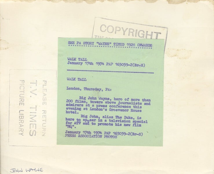 John Wayne Grosvenor House London 1974 Press event Stamped Original 8x10 Photo with paper caption snipe - VG Condition This item is an ORIGINAL 8x10 photo from the historic archives of Silver Screen Mementos. This original photograph was made in the actual year the film, television show or event was produced. The movie studios produced publicity photographs for distribution to the press, photo agencies and publicity departments to advertise the film/tv show or event. Very often original photos have press release information on the reverse of the photo - movie credits, description of the scene, event and people involved. This is a historic piece of cinema art and is being offered from one collector to another, no rights given or implied. Silver Screen are gradually releasing thousands of Original Photographs, Transparencies, Negatives, Lobby Cards, Posters, Magazines and other memorabilia from our historic archive.