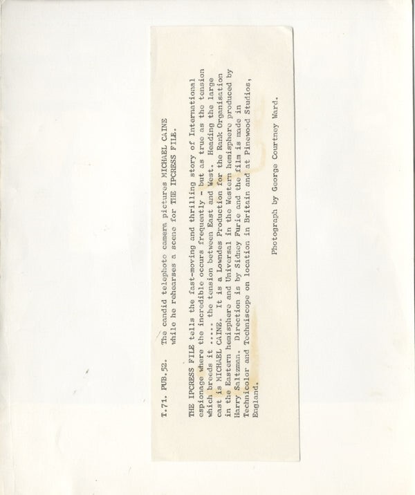 The Ipcress File 1965 Michael Caine rehearsing scene on set Original 7x9 approx Photo with Snipe VG Condition This item is an ORIGINAL 8x10 photo from the historic archives of Silver Screen Mementos. This original photograph was made in the actual year the film, television show or event was produced. The movie studios produced publicity photographs for distribution to the press, photo agencies and publicity departments to advertise the film/tv show or event. Very often original photos have press release information on the reverse of the photo - movie credits, description of the scene, event and people involved. This is a historic piece of cinema art and is being offered from one collector to another, no rights given or implied. Silver Screen are gradually releasing thousands of Original Photographs, Transparencies, Negatives, Lobby Cards, Posters, Magazines and other memorabilia from our historic archive.