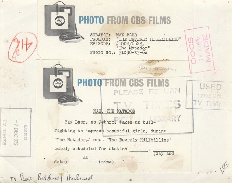Max Baer Jr The Beverly Hillbillies posing with bull Jethro The Matador 1967 Episode Portrait Original 7x9 Photo Stamped with Snipe Good/VG Condition (staples holes, wear to edges) This item is an ORIGINAL 8x10 photo from the historic archives of Silver Screen Mementos. This original photograph was made in the actual year the film, television show or event was produced. The movie studios produced publicity photographs for distribution to the press, photo agencies and publicity departments to advertise the film/tv show or event. Very often original photos have press release information on the reverse of the photo - movie credits, description of the scene, event and people involved. This is a historic piece of cinema art and is being offered from one collector to another, no rights given or implied. Silver Screen are gradually releasing thousands of Original Photographs, Transparencies, Negatives, Lobby Cards, Posters, Magazines and other memorabilia from our historic archive.