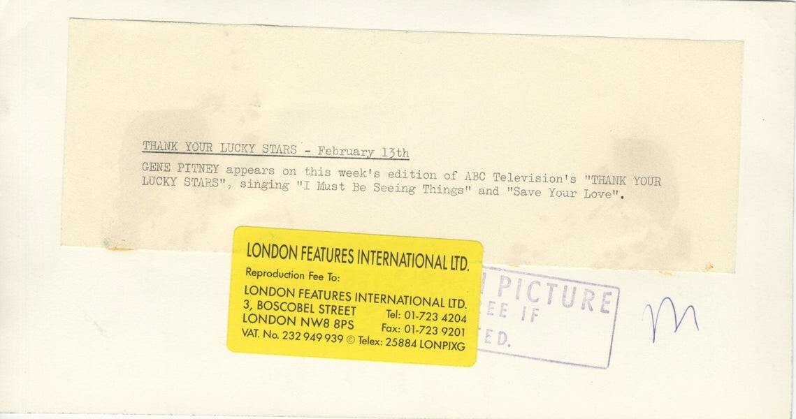 Gene Pitney Thank You Lucky Stars TV Show performance Original 5x9 approx Double Weight Photo Stamped Snipe VG/Near Mint Condition This is an Original vintage photograph from the year of the concert, photo shoot or event measuring approximately 7x9 inches (18x23cm) unless otherwise stated. Many Original vintage photographs carry the agency or photographer stamp on the back. This is a rare collectors item being offered from one collector to another, no nights given or implied. Silver Screen are gradually releasing thousands of Original Photographs, Transparencies, Negatives, Lobby Cards, Posters, Magazines and other memorabilia from our historic archive.