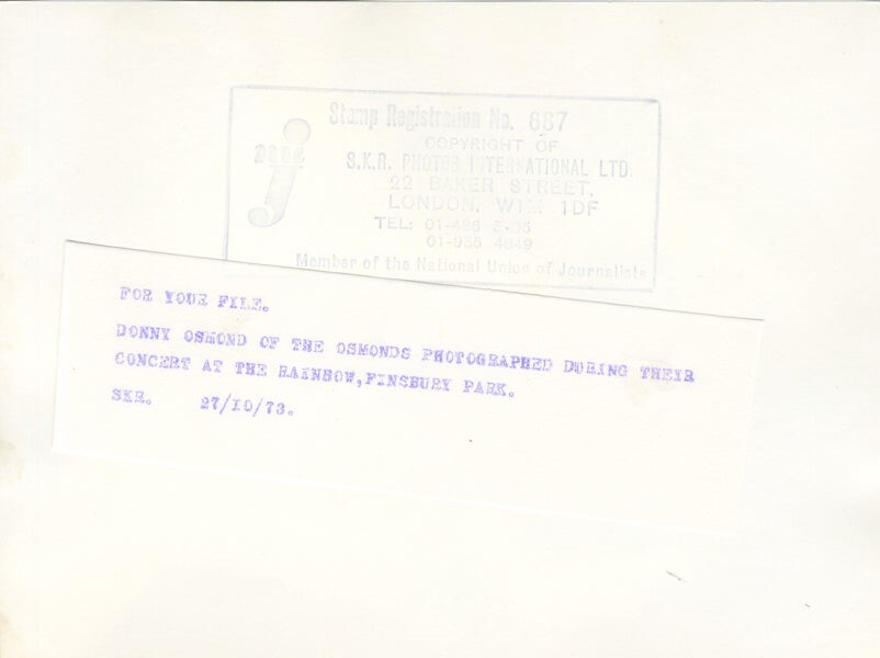 Donny Osmond singing in concert at the Rainbow Finsbury Park Original 6x8 Photo Stamped with Snipe VG/Near Mint Condition This is an Original vintage photograph from the year of the concert, photo shoot or event measuring approximately 7x9 inches (18x23cm) unless otherwise stated. Many Original vintage photographs carry the agency or photographer stamp on the back. This is a rare collectors item being offered from one collector to another, no nights given or implied. Silver Screen are gradually releasing thousands of Original Photographs, Transparencies, Negatives, Lobby Cards, Posters, Magazines and other memorabilia from our historic archive.