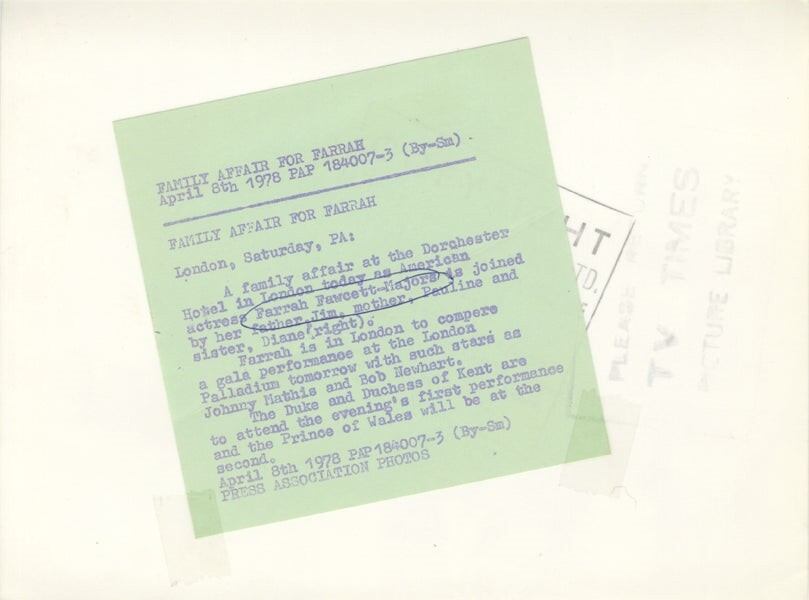 Farrah Fawcett & family London 1978 Stamped Original 7x9 Photo with snipe - VG/Near Mint This item is an ORIGINAL 8x10 photo from the historic archives of Silver Screen Mementos. This original photograph was made in the actual year the film, television show or event was produced. The movie studios produced publicity photographs for distribution to the press, photo agencies and publicity departments to advertise the film/tv show or event. Very often original photos have press release information on the reverse of the photo - movie credits, description of the scene, event and people involved. This is a historic piece of cinema art and is being offered from one collector to another, no rights given or implied. Silver Screen are gradually releasing thousands of Original Photographs, Transparencies, Negatives, Lobby Cards, Posters, Magazines and other memorabilia from our historic archive.
