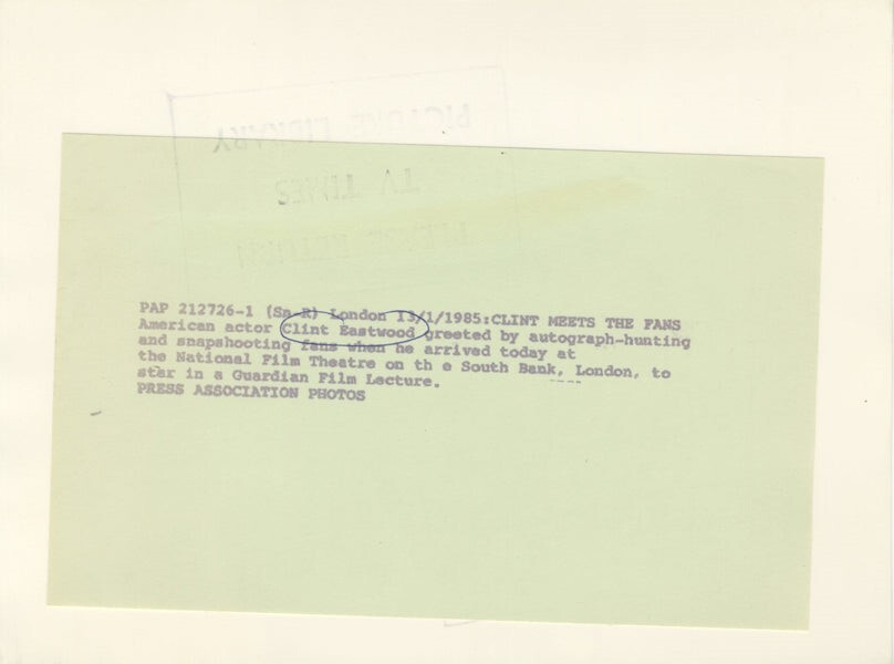 Clint Eastwood greets fand autograph hunters 1989 Original 8x10 approx Photo with snipe - Near Mint This item is an ORIGINAL 8x10 photo from the historic archives of Silver Screen Mementos. This original photograph was made in the actual year the film, television show or event was produced. The movie studios produced publicity photographs for distribution to the press, photo agencies and publicity departments to advertise the film/tv show or event. Very often original photos have press release information on the reverse of the photo - movie credits, description of the scene, event and people involved. This is a historic piece of cinema art and is being offered from one collector to another, no rights given or implied. Silver Screen are gradually releasing thousands of Original Photographs, Transparencies, Negatives, Lobby Cards, Posters, Magazines and other memorabilia from our historic archive.