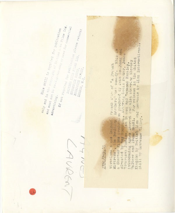 Agnes Laurent 1960 A French Mistress Leggy Pose tennis outfit Original 8x10 Photo Stamped with paper caption snipe VG Condition This item is an ORIGINAL 8x10 photo from the historic archives of Silver Screen Mementos. This original photograph was made in the actual year the film, television show or event was produced. The movie studios produced publicity photographs for distribution to the press, photo agencies and publicity departments to advertise the film/tv show or event. Very often original photos have press release information on the reverse of the photo - movie credits, description of the scene, event and people involved. This is a historic piece of cinema art and is being offered from one collector to another, no rights given or implied. Silver Screen are gradually releasing thousands of Original Photographs, Transparencies, Negatives, Lobby Cards, Posters, Magazines and other memorabilia from our historic archive.