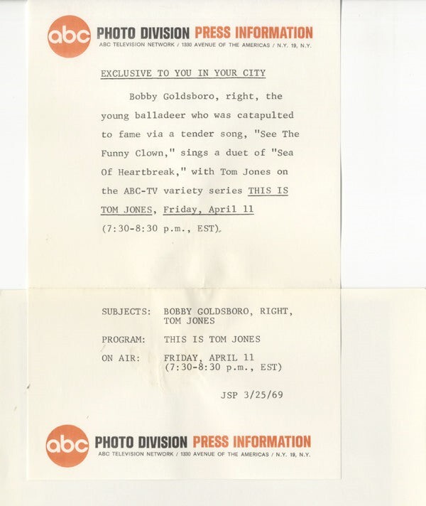 Tom Jones Bobby Goldsboro on TV Show 1969 ABC Paper Caption Snipe 7x9 Photo - Near Mint This item is an ORIGINAL 8x10 photo from the historic archives of Silver Screen Mementos. This original photograph was made in the actual year the film, television show or event was produced. The movie studios produced publicity photographs for distribution to the press, photo agencies and publicity departments to advertise the film/tv show or event. Very often original photos have press release information on the reverse of the photo - movie credits, description of the scene, event and people involved. This is a historic piece of cinema art and is being offered from one collector to another, no rights given or implied. Silver Screen are gradually releasing thousands of Original Photographs, Transparencies, Negatives, Lobby Cards, Posters, Magazines and other memorabilia from our historic archive.