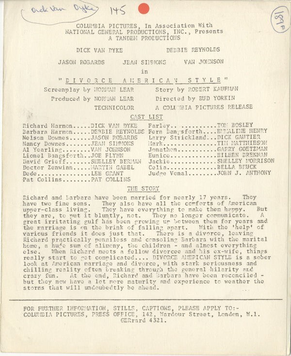 Dick Van Dyke laughing Divorce American Style 1967 Original 8x10 Photo with paper caption snipe - VG/Near Mint Condition This item is an ORIGINAL 8x10 photo from the historic archives of Silver Screen Mementos. This original photograph was made in the actual year the film, television show or event was produced. The movie studios produced publicity photographs for distribution to the press, photo agencies and publicity departments to advertise the film/tv show or event. Very often original photos have press release information on the reverse of the photo - movie credits, description of the scene, event and people involved. This is a historic piece of cinema art and is being offered from one collector to another, no rights given or implied. Silver Screen are gradually releasing thousands of Original Photographs, Transparencies, Negatives, Lobby Cards, Posters, Magazines and other memorabilia from our historic archive.