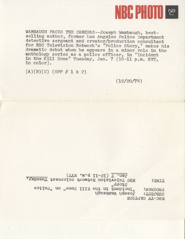 Police Story TV Series 1974 Joseph Wambaugh Original 7x9 Photo NBC snipe - Near Mint Condition This item is an ORIGINAL 8x10 photo from the historic archives of Silver Screen Mementos. This original photograph was made in the actual year the film, television show or event was produced. The movie studios produced publicity photographs for distribution to the press, photo agencies and publicity departments to advertise the film/tv show or event. Very often original photos have press release information on the reverse of the photo - movie credits, description of the scene, event and people involved. This is a historic piece of cinema art and is being offered from one collector to another, no rights given or implied. Silver Screen are gradually releasing thousands of Original Photographs, Transparencies, Negatives, Lobby Cards, Posters, Magazines and other memorabilia from our historic archive.