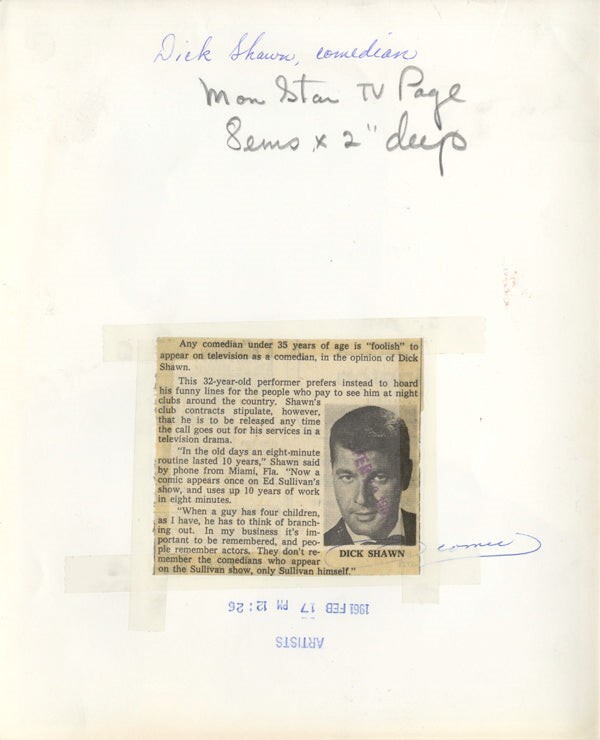 Dick Shawn 1961 Comedian Portrait Original 8x10 Photo Stamped with Newspaper Clipping VG Condition This item is an ORIGINAL 8x10 photo from the historic archives of Silver Screen Mementos. This original photograph was made in the actual year the film, television show or event was produced. The movie studios produced publicity photographs for distribution to the press, photo agencies and publicity departments to advertise the film/tv show or event. Very often original photos have press release information on the reverse of the photo - movie credits, description of the scene, event and people involved. This is a historic piece of cinema art and is being offered from one collector to another, no rights given or implied. Silver Screen are gradually releasing thousands of Original Photographs, Transparencies, Negatives, Lobby Cards, Posters, Magazines and other memorabilia from our historic archive.